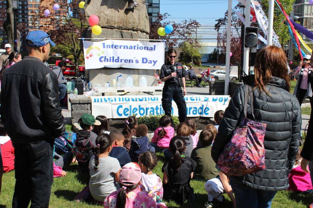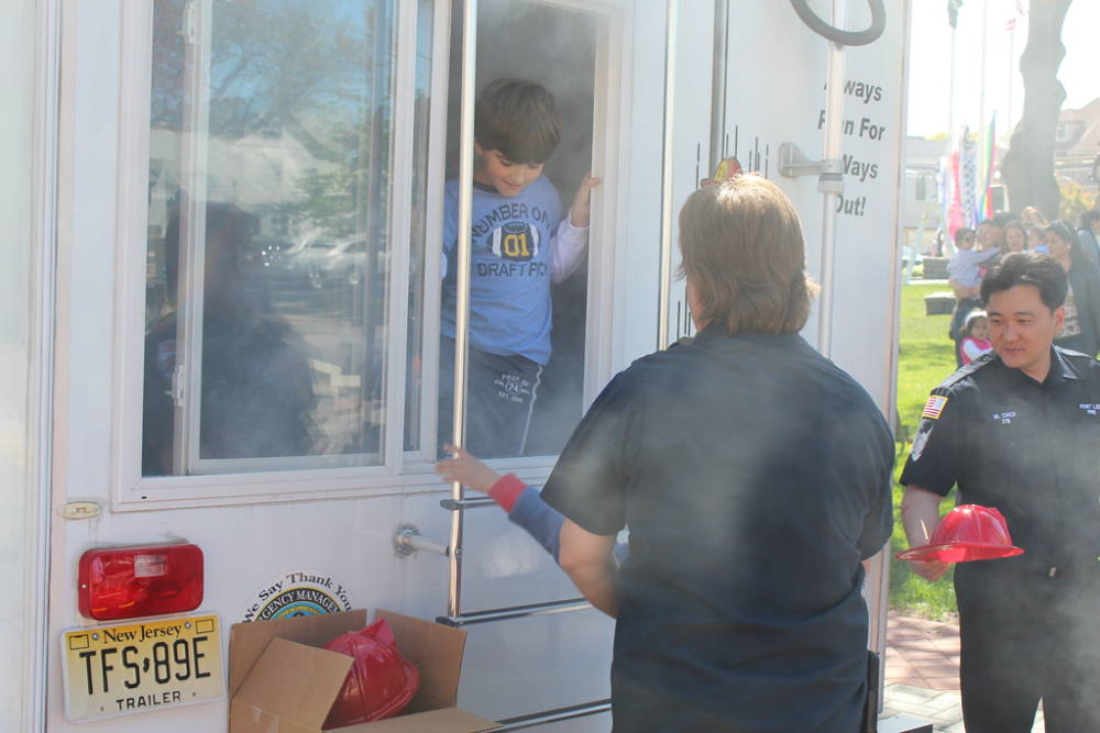 はじめに、フォートリー市庁舎前に集まり、鯉のぼりをポールに掲げ、英語で「鯉のぼり」をみんなで歌います。それから、様々な民族衣装を着た子供たちがパトカーに先導されて、メインストリートをパレードし、モニュメントパークに到着すると、鯉のぼりや風船で飾られた公園が待っています。BIWANKOの太鼓演舞、大山空手のデモストレーション、そしてフォートリー消防署から子供たちに、火事になった家から脱出する訓練トラックを使って、現場を実際に子供たちが経験するという消防署の企画に、みんなびっくりでした。