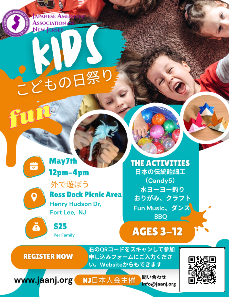 5月7日(日曜)に子どもの日祭りを行います。五月晴れの良いお天気が続く様子なので、屋外で行います。せっかくですから、パパもママもお子さんもみんなで楽しめるようにBBQをやりましょう。場所は、ジョージワシントンブリッジが良く見える川沿いの公園です。そして目玉は、ディズニーワールドで大人気の飴でキャラクターを17年間作っていた、日本伝統の飴細工師のCandy5がやってきて、キッズに大人気のアニマルやキャラクターを目の前で作ってくれます。手のひらで丸められた飴があっという間に動物になる様子に子供たちは釘付けになること間違いなしで!!(作った飴細工は1本$5で購入できます)。そのほか、水ヨーヨー釣りや綱引きなど、キッズが3歳から12歳のお子さんが喜ぶアクティビティをたくさん用意しています。自分でシャカシャカ手作りして歌って遊ぼう!