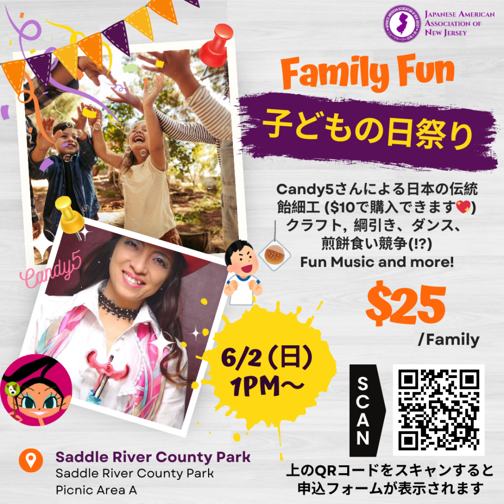 6月2日(日曜)に子どもの日祭りを行います。場所は、Saddle Brook にあるSaddle River County Park。日本伝統の飴細工の技法で、ディズニーワールドでディズニーキャラクターを作っていたCandy5さんが、今年もやってくる!子供に大人気のキャラクター飴細工などを希望で選べます。目の前で飴細工が見られます (作った飴細工は1本$10で購入できます)。そのほか、水ヨーヨー釣りや綱引き、煎餅食い競争など、お子様が喜ぶアクティビティをたくさん用意しています。